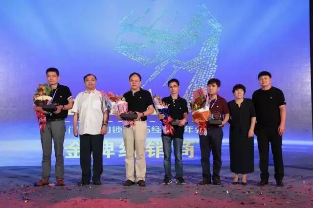 中国五金制品协会理事长石僧兰(右二)、执行理事长张东立(左二)与名门董事长兼总经理陈力(右一)共同为金牌经销商一等奖获得者颁奖